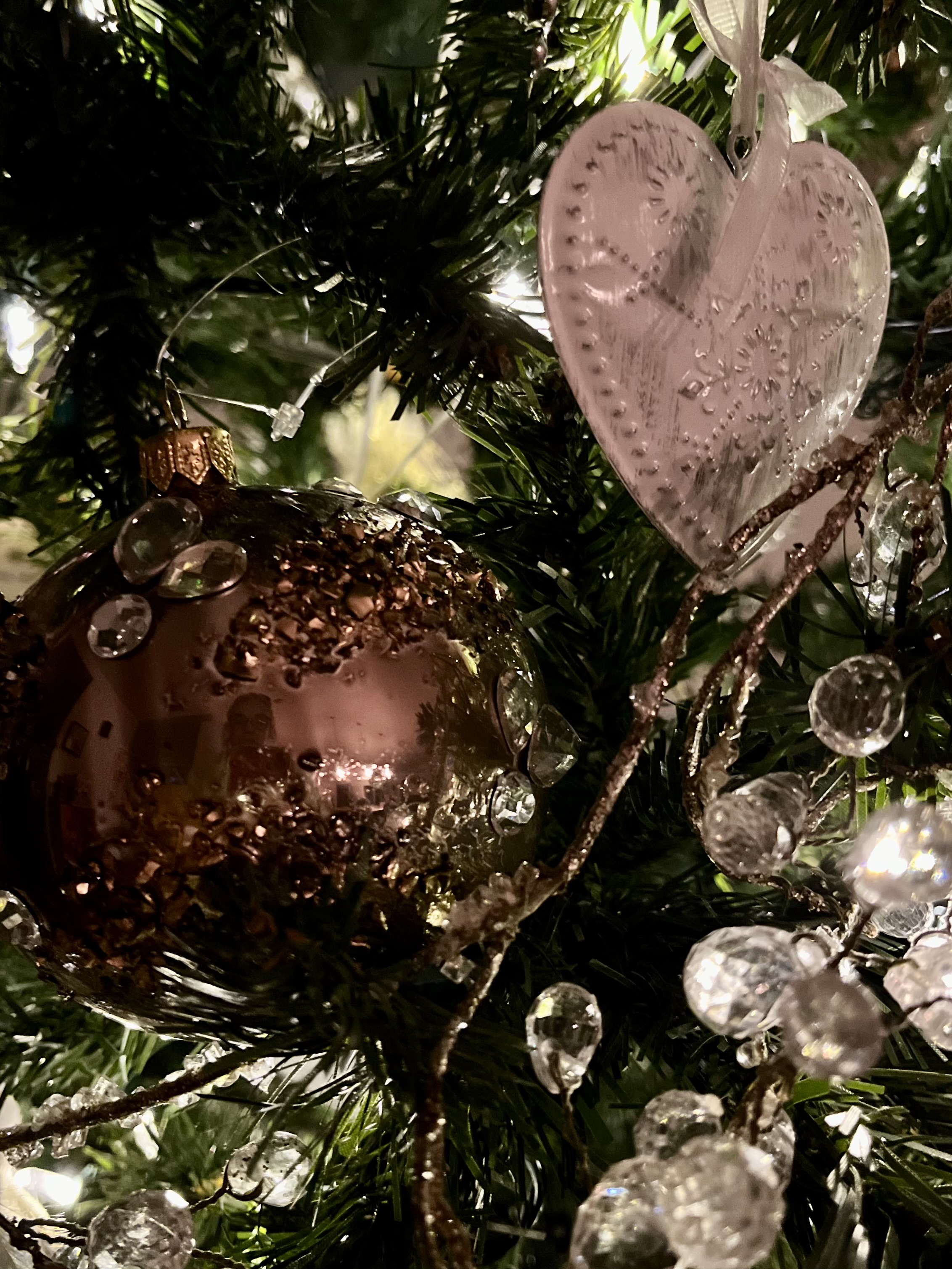 With each decoration, I wove a story in my head about its journey home. The crystal balls I bought with my daughter in Vancouver became the prized possessions of a little girl who sang songs into the glass, hoping that one day, whoever held them would hear her sweet voice and feel at home, wherever in the world they were. Three miniature pottery houses became the dwellings of a fairy family whose only job was to light the forest with their sparkle, until a hunter found them and brought them home to his wife, who cherished them until her last breath.