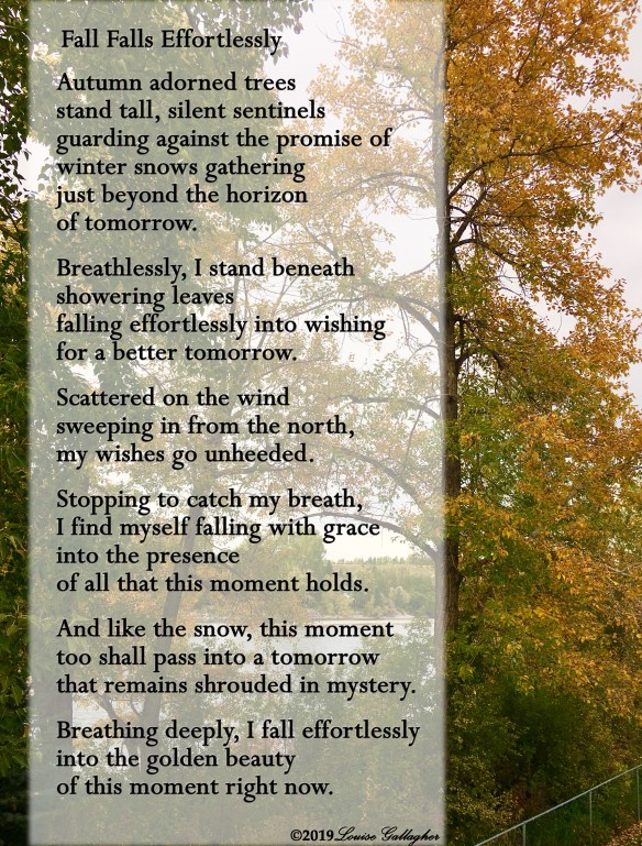 There’s snow coming tomorrow, the weatherman intones and I breathe deeply into the beauty of each golden leaf falling gracefully.