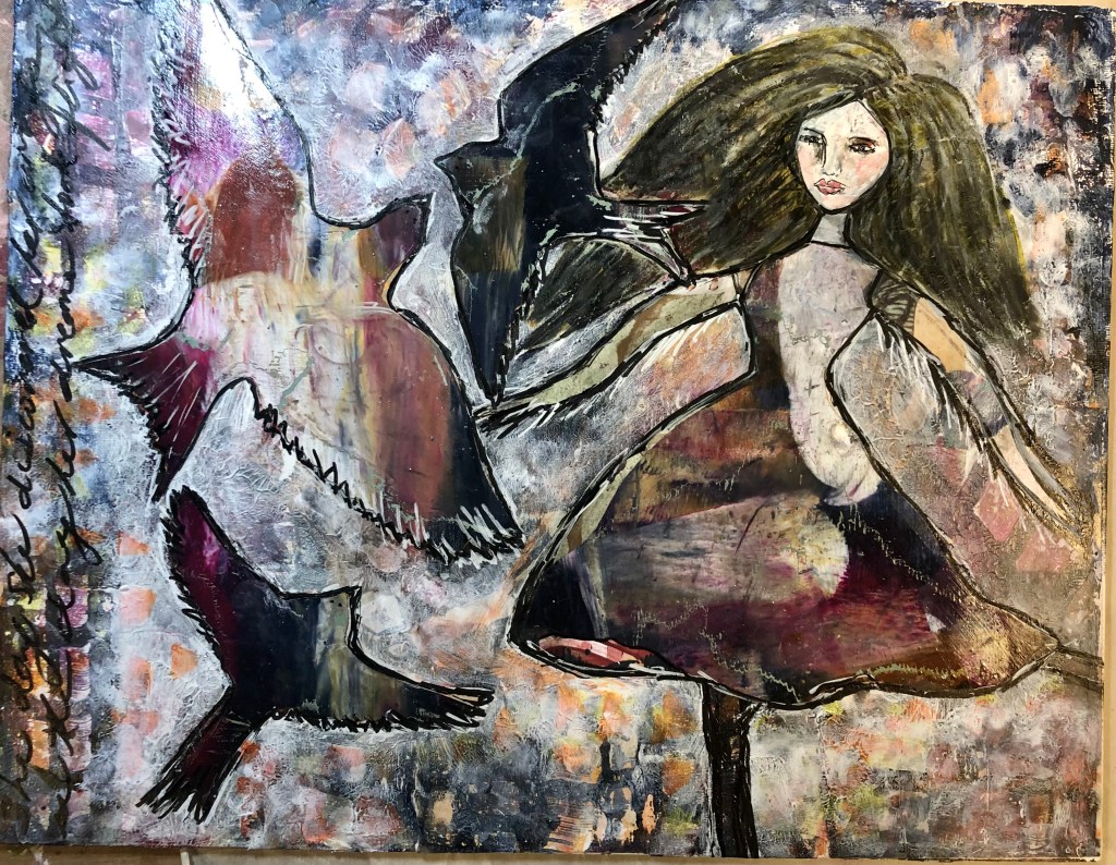 I love how you let your creative spirit fly. The painting with the red looks almost like she steps out of the illusion and into the real. So so pretty! I think those doves represent the peace she finds there ❤