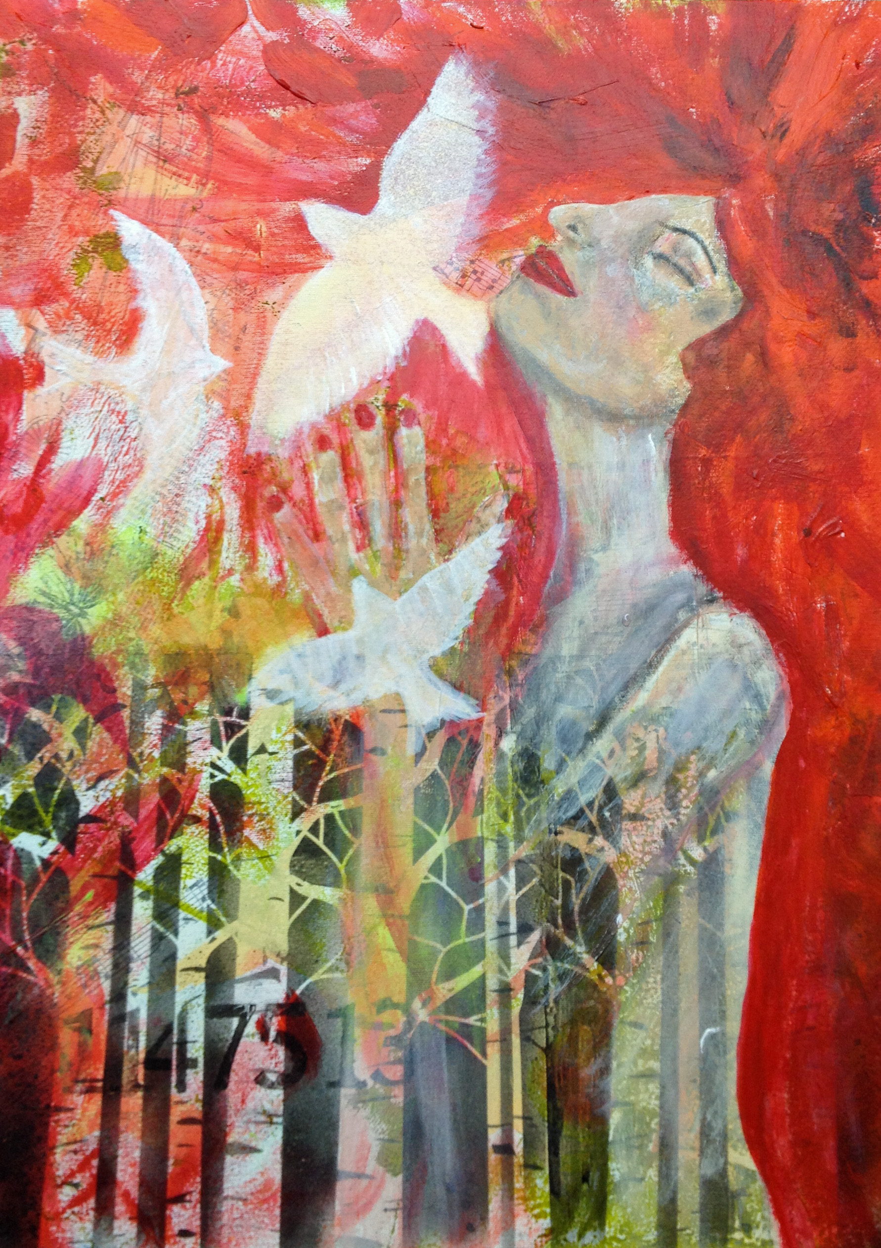 I love how you let your creative spirit fly. The painting with the red looks almost like she steps out of the illusion and into the real. So so pretty! I think those doves represent the peace she finds there ❤