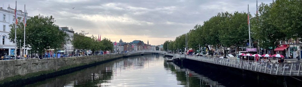 I am entranced by its calm beauty slipping along through the centre of Dublin while traffic zooms and people walk and sit along the wide sidewalks that follow its course the centre of the city.