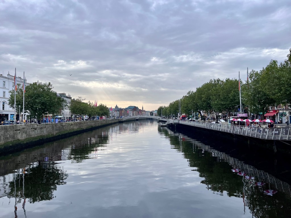 I am entranced by its calm beauty slipping along through the centre of Dublin while traffic zooms and people walk and sit along the wide sidewalks that follow its course the centre of the city.