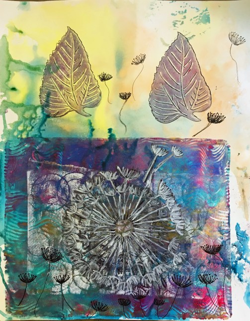 But, here’s the thing. There are only so many pretty paintings of flowers I can create before becoming bored, or at least somewhat tired, of the lack of challenge in the art-making. (a little self-confession – I was challenged by the flower in the middle when I created this painting. It wasn’t working so I really had to work at creating something out of the big blob it first appeared to be — which I admit, was fun and challenging, but it still became… just another pretty flower painting…)