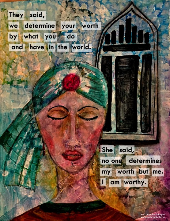 Yesterday, the wild woman within returned. This painting is No. 48 in the series. “I am worthy.”